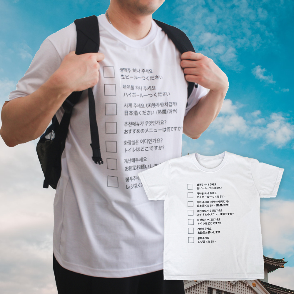 일본여행 통역 반팔 티셔츠 웃긴티셔츠 - 킹받는 웃긴 병맛티 우정티 가족여행 일본여행티셔츠 일본어티 가족 패밀리룩 여행티셔츠 번역 식당 관광 일본어 쓸데없는 반팔티
