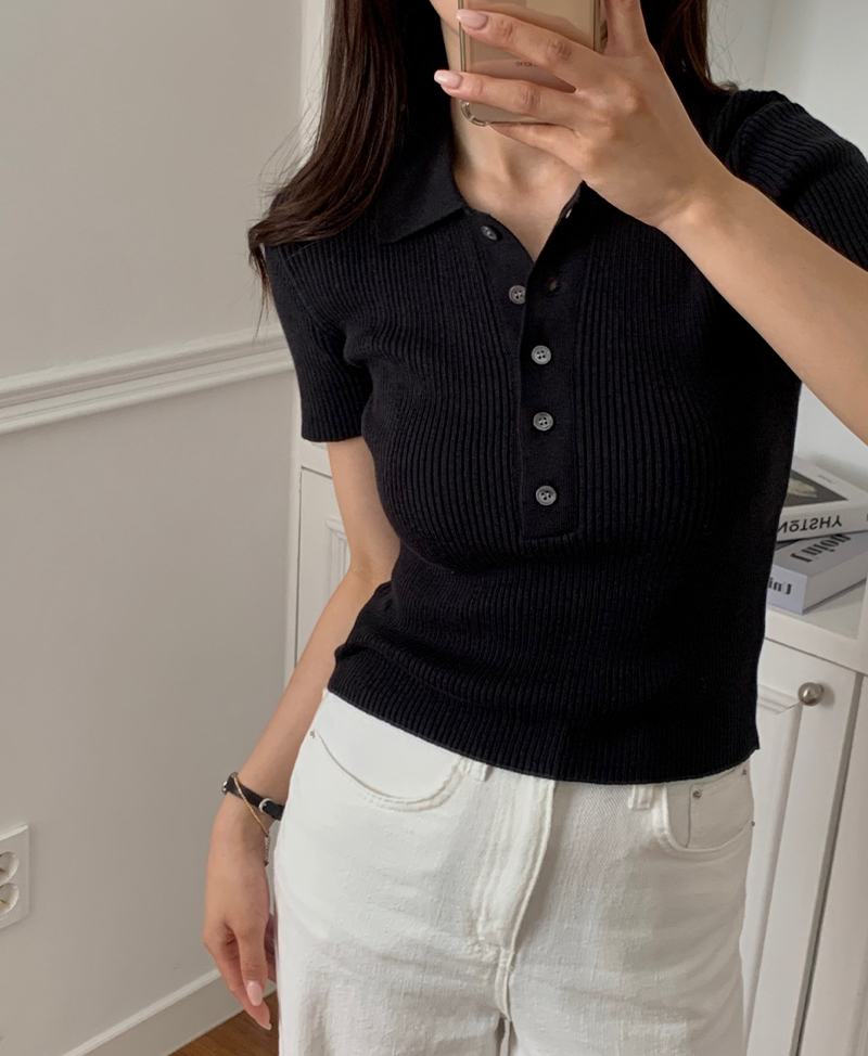 미닝 골지 버튼 카라 반팔니트 5color (간절기/ 간절기니트/ 하객룩/ 여름/ 여름니트/ 반팔니트/ 여름하객룩/ 출근룩/ 슬림핏/ 골지니트)