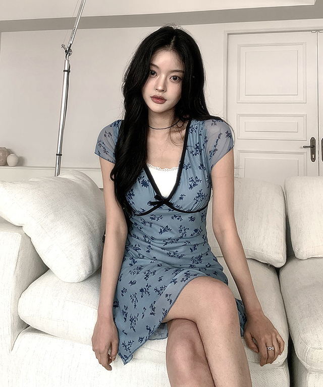 [여리핏💗] 카르멘 브이넥 리본 플라워 시스루 시폰 여름 미니 원피스 / 휴가룩 페스티벌룩 휴양지룩 데이트룩 클래식블랑