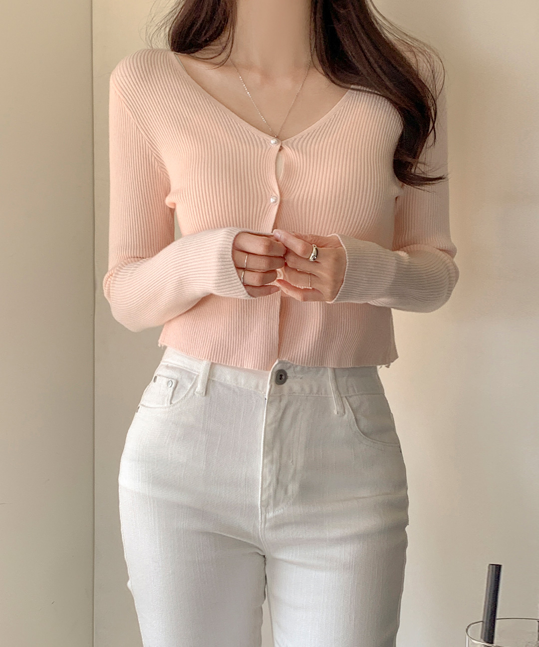 프먼 브이넥 골지 니트 진주 크롭 가디건