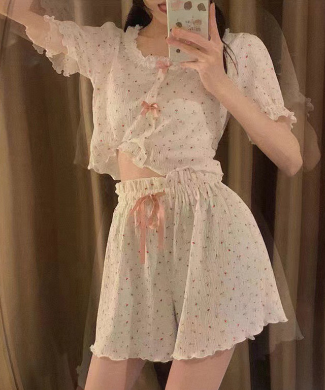 반팔 반바지 데일리 러블리 플로럴리본 상하세트 파자마 여름 여성 파자마세트 (3528)