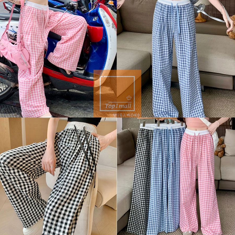 Ollimo 여자 여름 팬츠 밴딩 바지 체크패턴 와이드팬츠 통바지 고무줄 쿨링팬츠 실내복