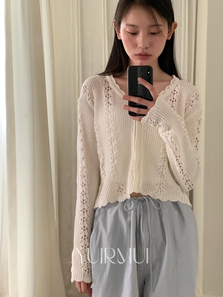 [아이 당일] JINSIM 진심 스카시 코튼 펀칭 프릴 라운드 니트 가디건 4color
