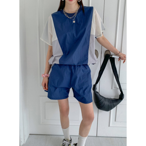 유피스 바스락 배색스트링 반팔티+배색반바지 세트 PS684
