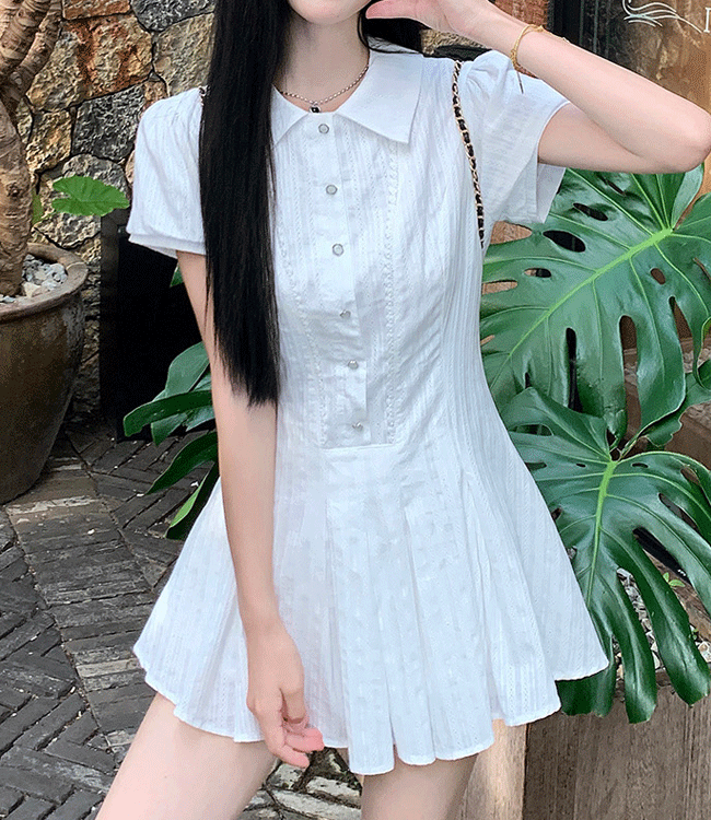 러블리 화이트 퍼프소매 슬림핏 데이트룩 반바지포함 레이스 플리츠 여리여리 셔츠 미니 원피스