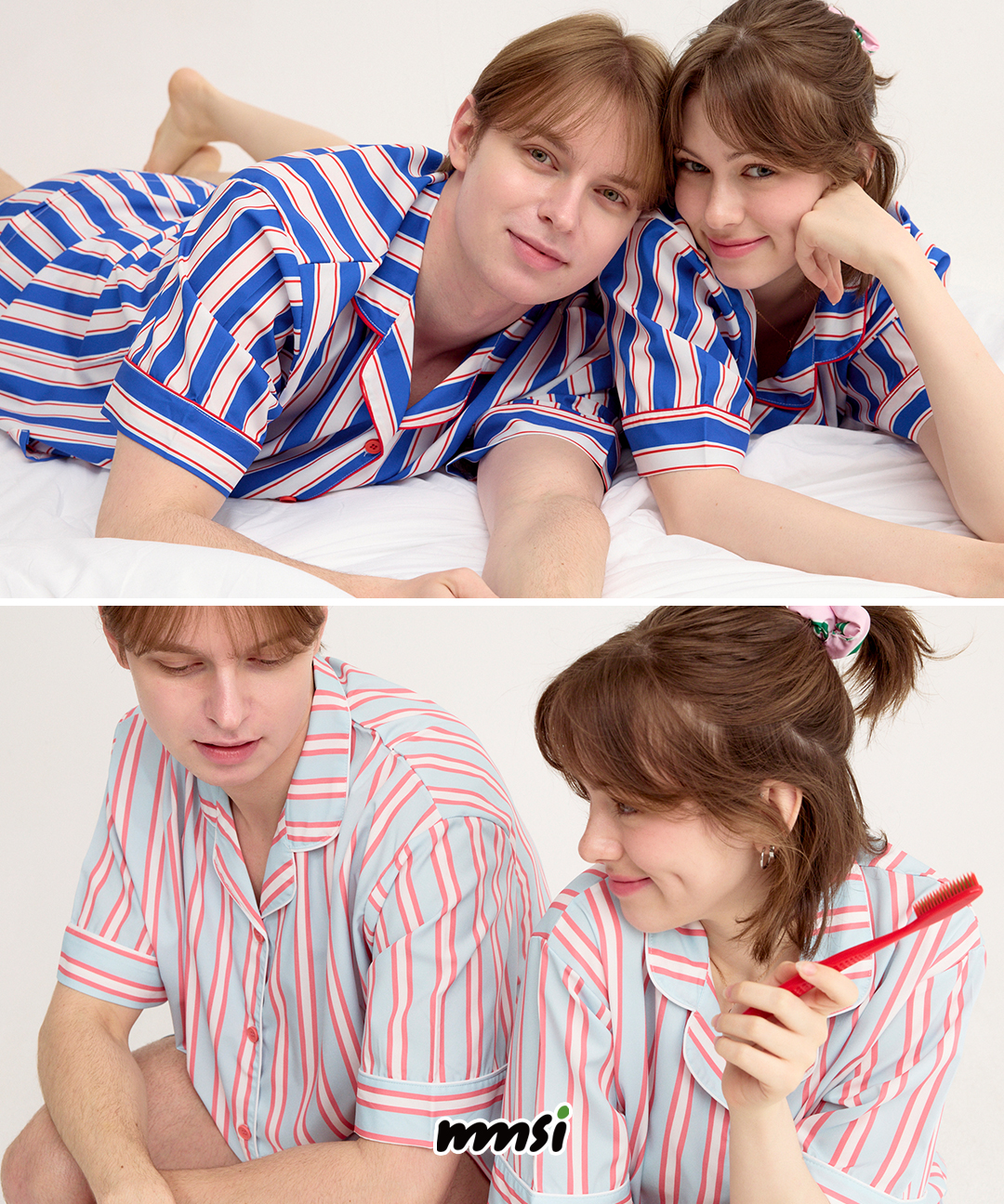 크러쉬_세레인 스트라이프 오픈 반팔 파자마 세트 여름 커플 잠옷 M/L/XL