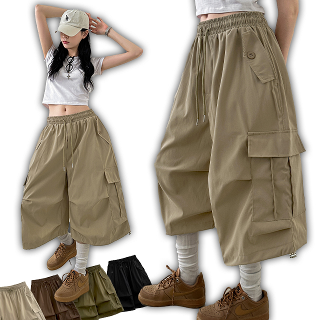 [7부기장/밑단스트링] 로우 카고 포켓 스트링 버뮤다 팬츠