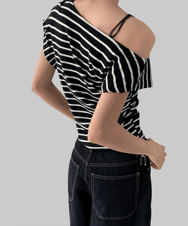 리트렌 스트라이프 원숄더 반팔 티셔츠