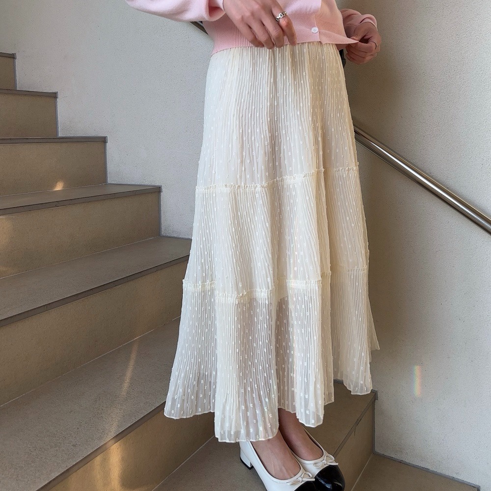 봄 여름 도트 플리츠 쉬폰 레이스 플레어 캉캉 롱 스커트 치마