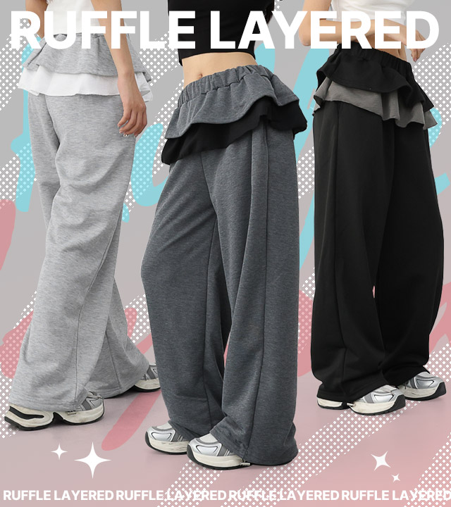 🖤하비추천/핏감보장🖤 러플 레이어드 와이드 밴딩 스트링 트레이닝 팬츠 바지 추리닝 츄리닝 운동복 데일리 캐주얼 긴바지 롱팬츠 L-5504