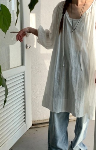 [시스루레이어드 하늘하늘🩵당일발송] 넥스트링 루즈핏 시스루 레이어드 롱 블라우스 2color