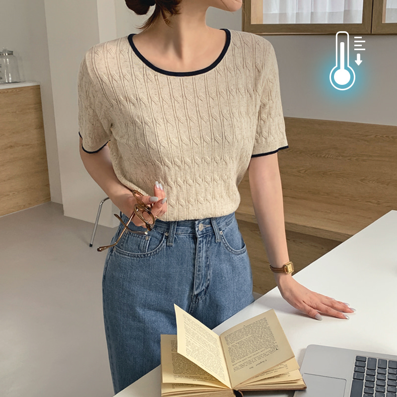 [여름니트🌴] #MADE [tnt0615] 라티스 배색 라운드 케이블 니트(배색니트,포인트니트,반팔니트,여름니트,케이블니트,라운드니트,어나더트위)