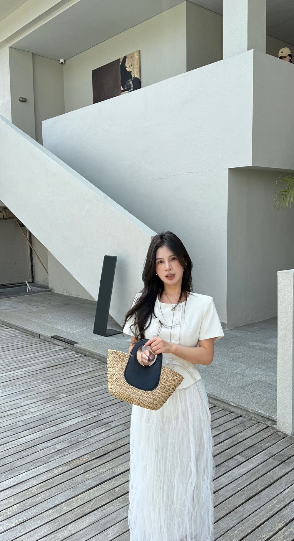 결혼식하객룩 클래식 더블 버튼 반팔 여름자켓 + 주름 시스루 롱스커트 투피스 세미정장 셋업 여름하객룩 블랙세트 화이트세트 데이트