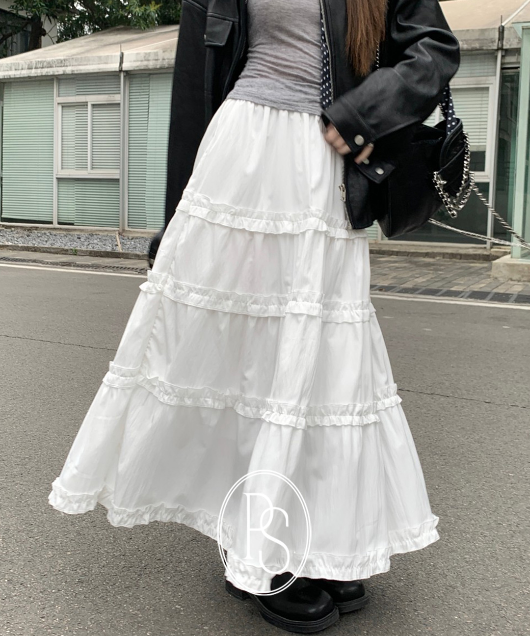 하츠 캉캉 프릴 플레어 화이트 롱 스커트