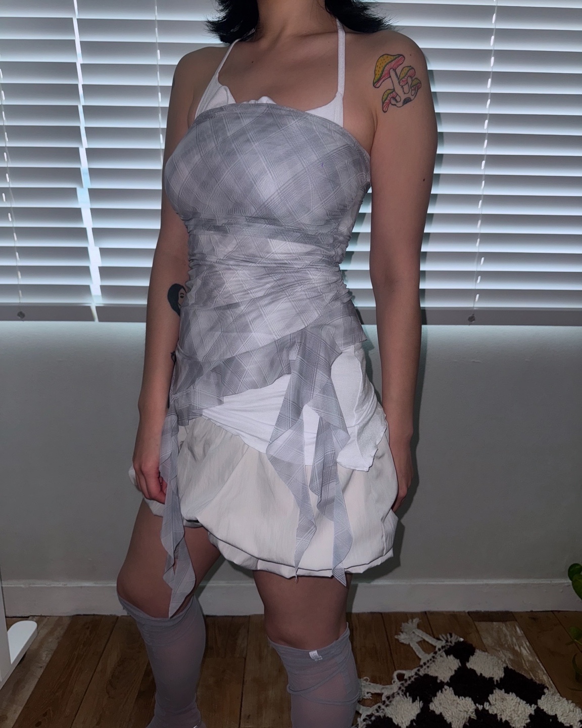 체크 셔링 프릴 언밸런스 레이어드 메쉬 튜브 탑