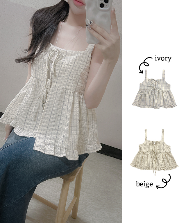 [레이어드룩/심쿵러블리] 체크 패턴 앞 리본 뷔스티에 나시 블라우스 2 COLORS