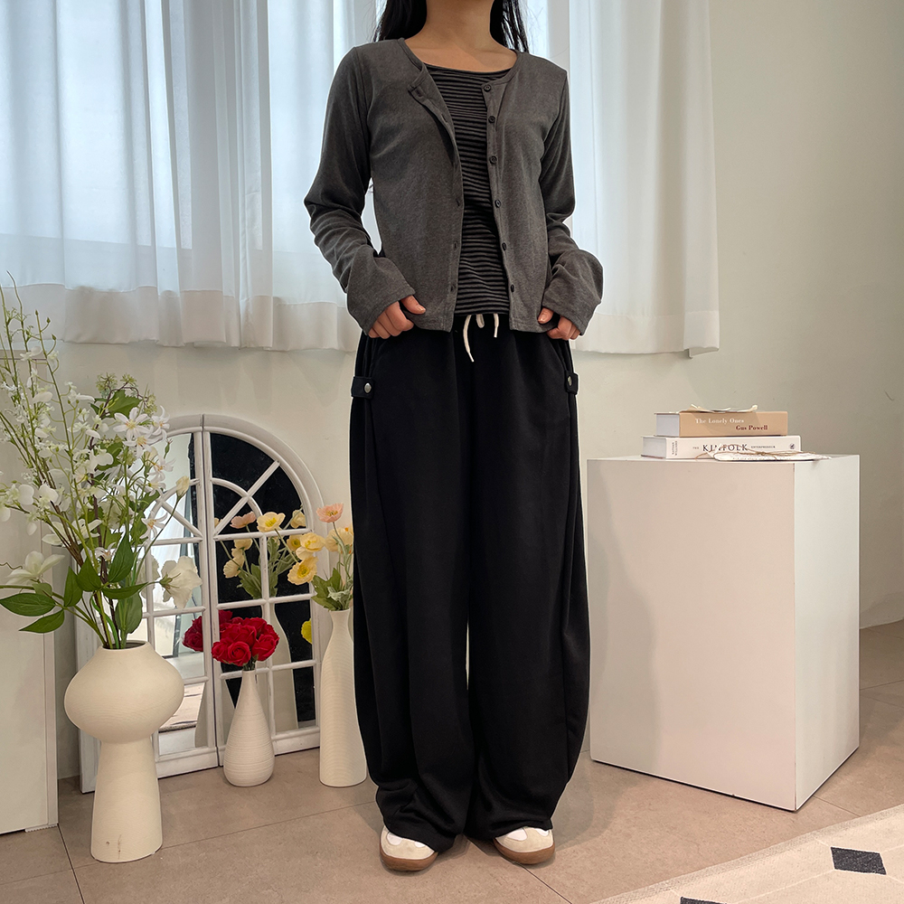와이드 트레이닝 밴딩 팬츠 비조 사이드 스냅 버튼 하이웨스트 롱팬츠 (블랙)