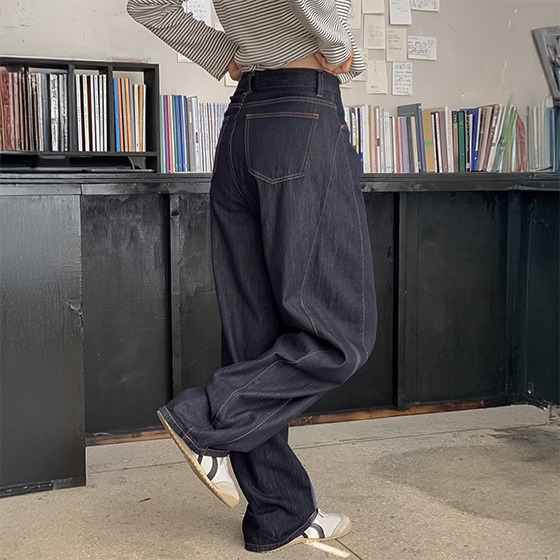 [오늘출발] 벌룬 투라인 생지 데님팬츠 (커브드진,논페이드생지,생지데님,사계절,와이드청바지,흑청데님,벌룬데님,하객룩,출근룩)