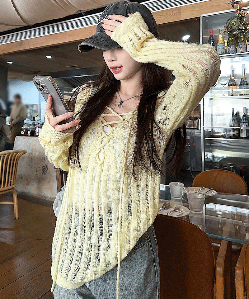 [스트라이프/원숄더/커버업/레이어드룩/여리핏💗] 타스카 스트링 데미지 시스루 니트 / 2Color