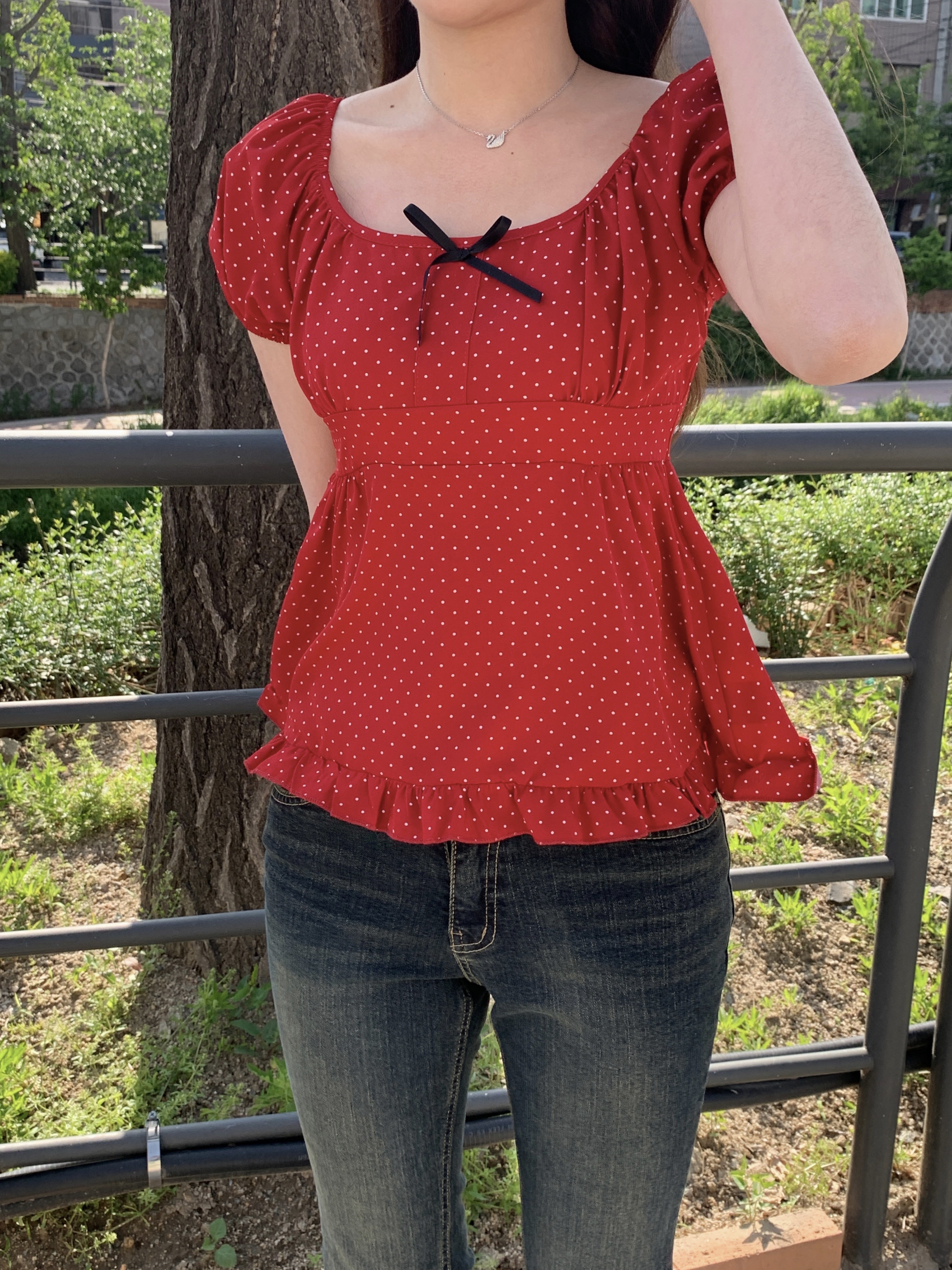 [오늘출발/데일리] 여름신상 바질 레드 도트 블라우스 어깨퍼프 반팔블라우스 레드블라우스 리본블라우스