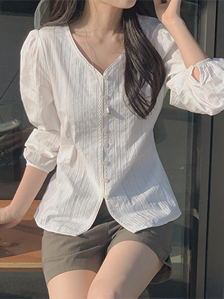 퓨어 코튼 스트랩 블라우스 (2type,긴팔블라우스,반팔,브이넥,레이스,퍼프,허리스트랩,사계절,하객룩,출근룩)