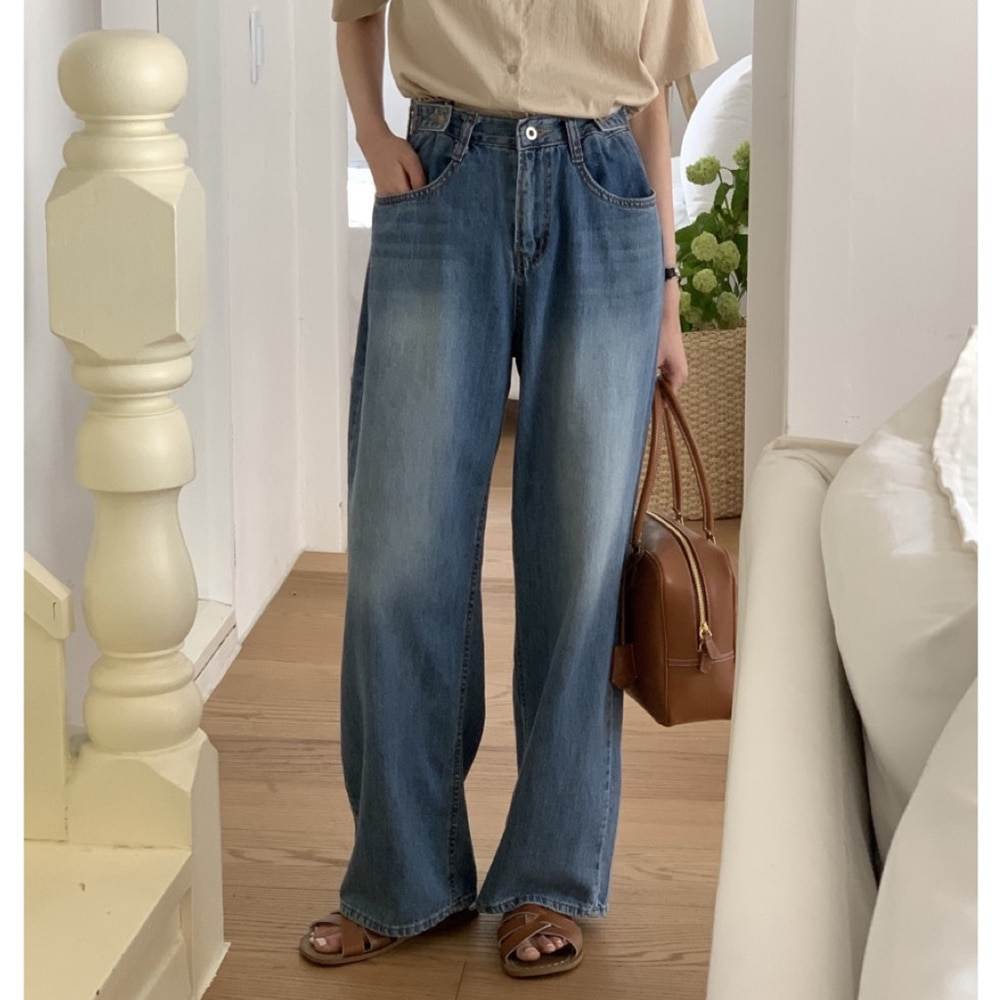 쓰리쿼터 여름 얇은 와이드 비조 핀턱 연청 중청 통 넓은 데님 팬츠 데일리룩 롱기장