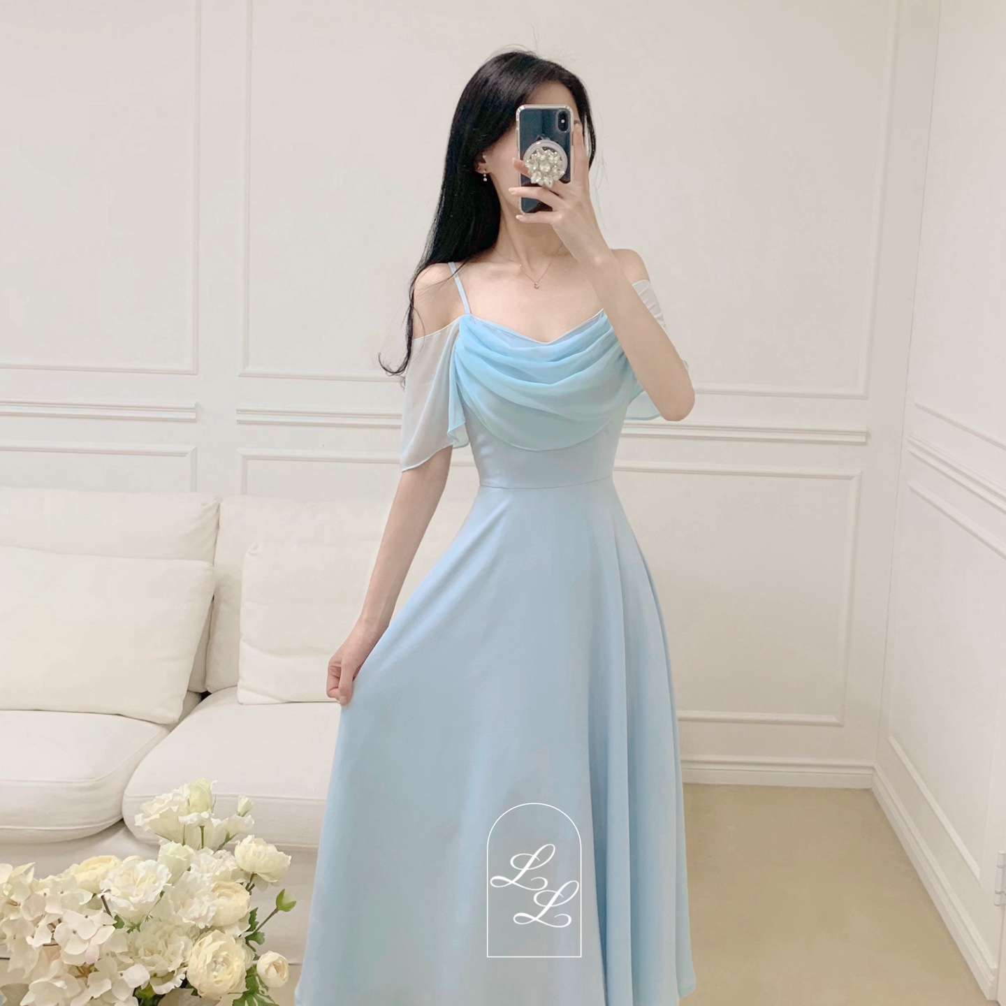 🩵쿨톤pick!/자체제작🩵 롱수아 이중 쉬폰 셔링 시스루 드레이프 허리 끈 오프숄더 원피스 드레스 (4color) 여름 셀프웨딩 브라이덜샤워 졸업사진 스냅사진 휴양지룩 해외여행
