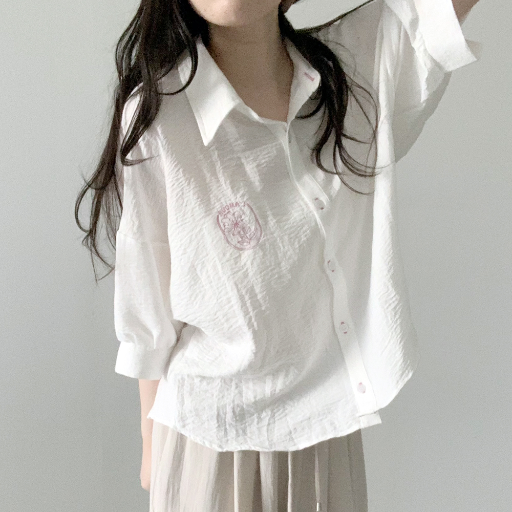 [44-77] 크러시 플라워 자수 오버핏 카라 반팔 블라우스 / 여름 지지미 루즈핏 빅사이즈 소매 트임 반팔티 기본템 심플 무지 데일리룩 시원한 아이스 여성 55 66 얇은 티셔츠