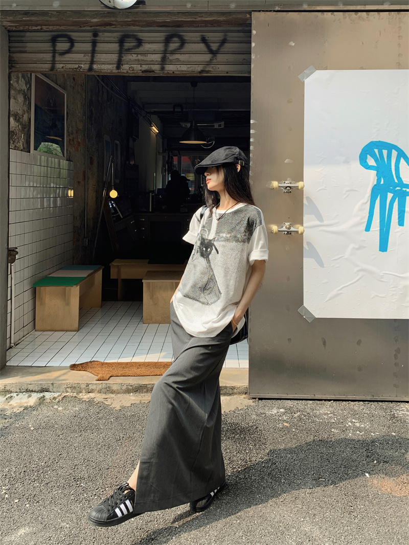 (코디세트)유니크 프린팅 반팔 티셔츠+사이드 슬릿 베이직 롱스커트 세트 루루드랑FN427