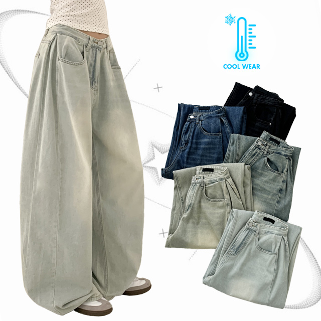 [쿨링소재/여름청바지] 포켄드 사이드핀턱 빈티지워싱 와이드 벌룬핏 데님 팬츠 (5color)