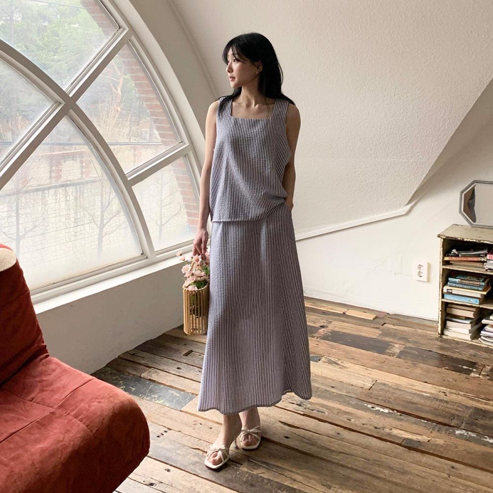 여자 주름핏 줄지 민소매 블라우스 롱 스커트 세트
