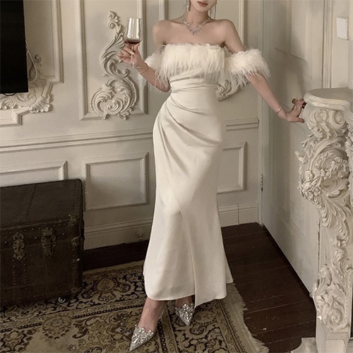 [셀프웨딩/스냅촬영/파티룩/드레스] 퍼 오프숄더 실크 슬림 웨딩드레스 3size [백스모킹아일렛 실크드레스 슬림드레스 퍼드레스 퍼오프숄더 화이트원피스]