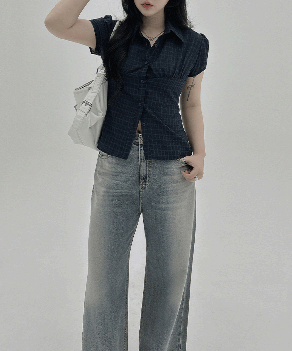 #13373 허리잘록 체크 셔링 카라 반팔 셔츠 블라우스 : 3color