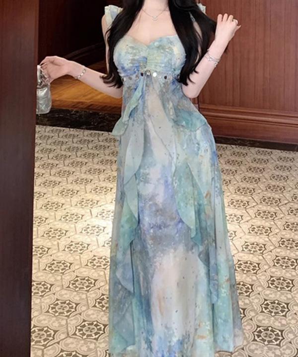 마롱 러블리 프릴 심플 민소매 A라인 롱원피스