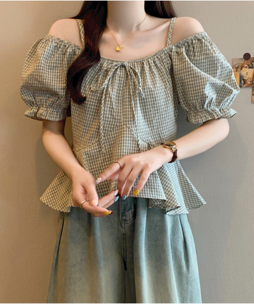 L-4XL 러블리 통통녀 리본 체크 패턴 벌룬소매 오프숄더 상의 티 데이트룩