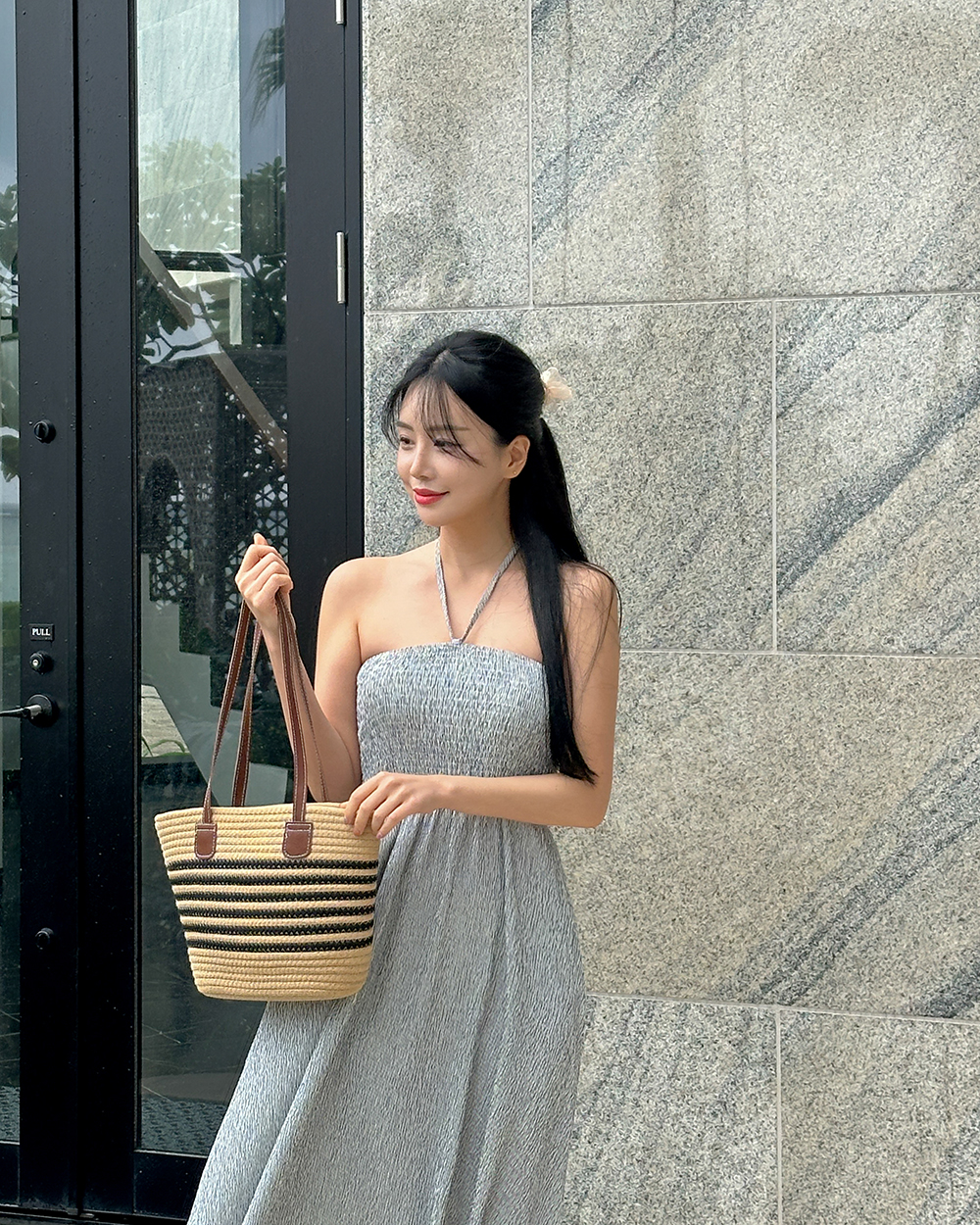 [44-66] 루카 트임 홀터넥 스모크 밴딩 원피스 [롱원피스/스퀘어넥/썸머/여행룩/비치/휴가룩/비치웨어/여리여리/오프숄더/쿨링/A라인원피스/바캉스]
