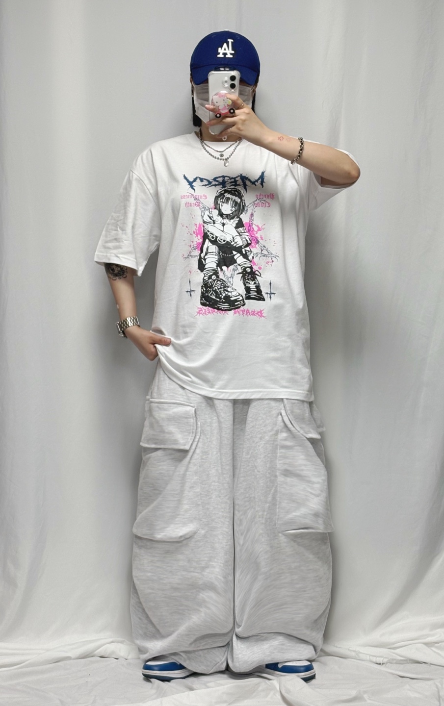 키치패러캐릭터반팔티셔츠 유니섹스 오버핏 스트릿 유니크 Y2K 애니 나염 캐릭터티셔츠 애니캐릭터 댄서복 의상복 단체복 코스프레 남여공용반팔티셔츠