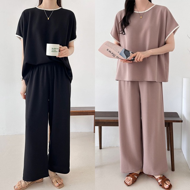 빅사이즈 여름 배색 반팔 와이드바지 편한 코디 세트 꾸안꾸룩 데일리 상하의 셋업