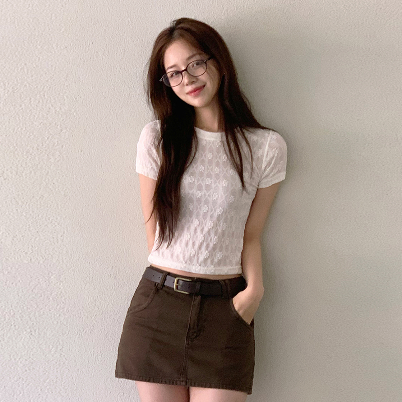 [코디추천]쁘띠 플라워 레이스 시스루 크롭 반팔 티셔츠