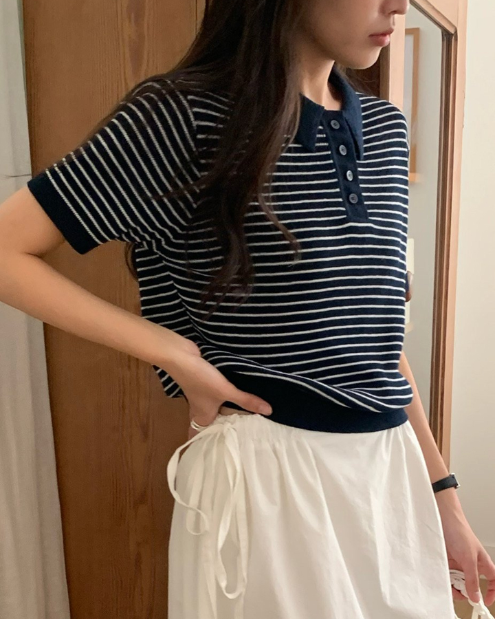 (당일)세이지 린넨 스트라이프 니트 여름 데이트룩 오피스룩 깔끔 세미크롭 반팔(87084)