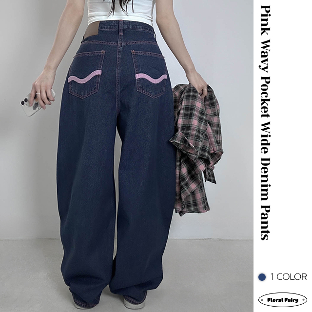 [골반커버💕/3size] 핑크 웨이브 포인트 포켓 와이드 데님 팬츠 - 1color 국내제작 봄 여름 가을 겨울 사계절 데이트룩 데일리룩 꾸안꾸 빈티지 유니크 힙 학생 여행