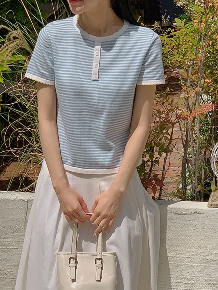 [체형커버/데일리 만능템] [44-120] 유키닐 코튼 배색 스트라이프 프릴 반팔 티셔츠 (여름-신상-데일리룩-데이트룩-러블리룩-여행룩-빅사이즈-자체제작-줄무늬-면티셔츠-여름티-여름반팔-세미크롭)