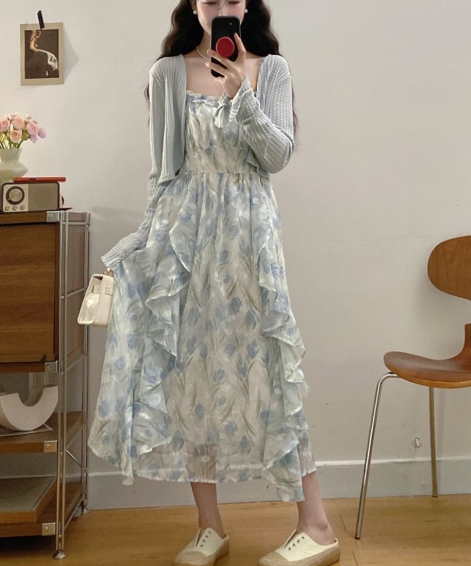 L~4XL러블리 로맨틱 가디건 롱원피스 투피스 통통녀 바캉스 제주도여행 세트