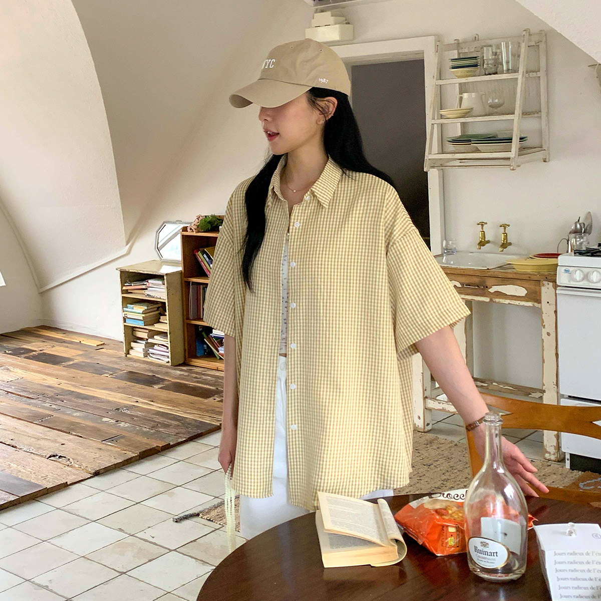 [당일발송,비비드] 시어서커 오버핏 체크 반팔셔츠