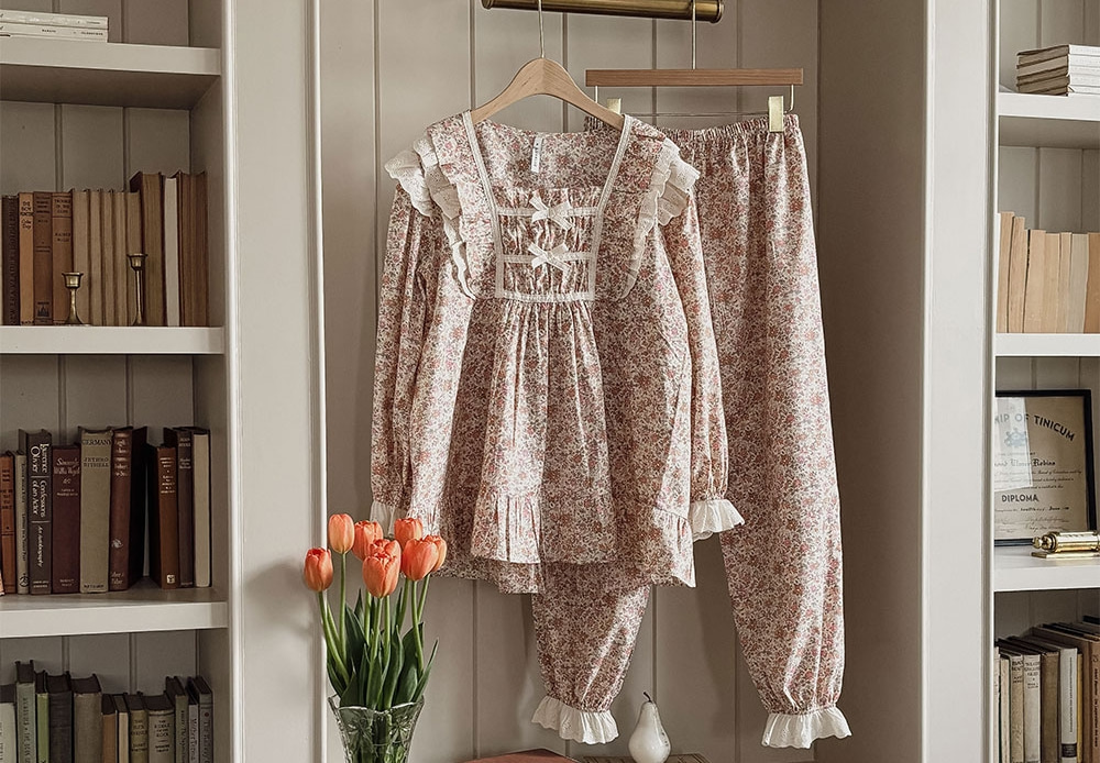 여성 마멀레이드 코튼 스퀘어넥 긴소매 긴바지 투피스잠옷