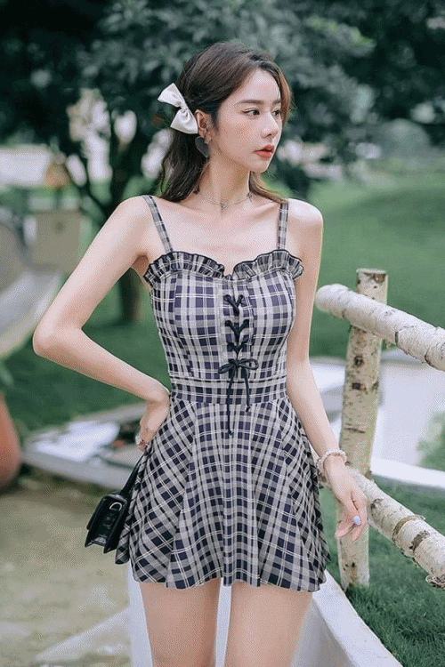 수영복👙로냐 더블체크 프릴 코르셋 원피스수영복
