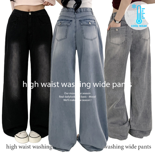❄️[냉감팬츠/3기장/여름팬츠] 모투이 하이웨스트 밴딩 힙포켓 쿨링 워싱 와이드 데님 팬츠 (3color)