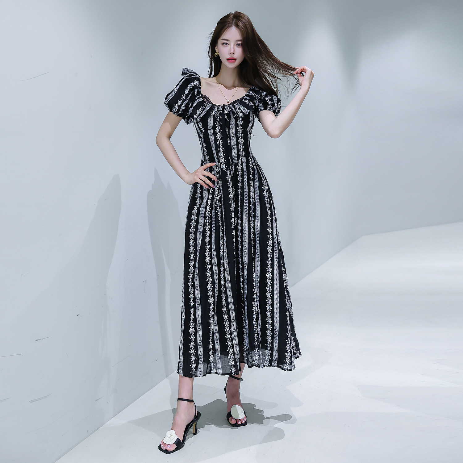 Pettit 스모크 레이스 에스닉 플라워 자수 쉬폰 프릴 롱 원피스 (3color) - 20% 할인