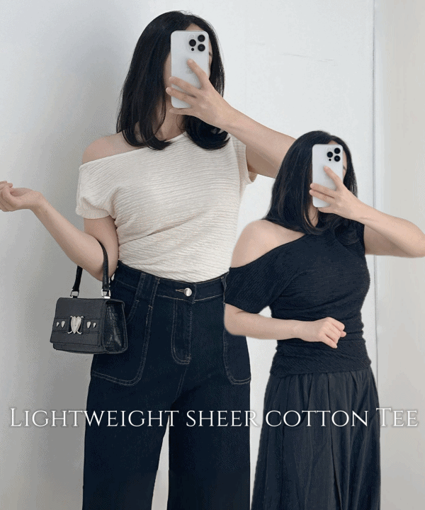 [✨날씬핏/통통녀] 원숄더 지지미 시어서커 언발 오프숄더 슬림 플리츠 반팔 티셔츠