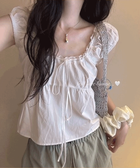 [에겐녀의 정석🤍/뒷리본!] 프릴 셔링 레이스 리본 반팔 화이트 블라우스